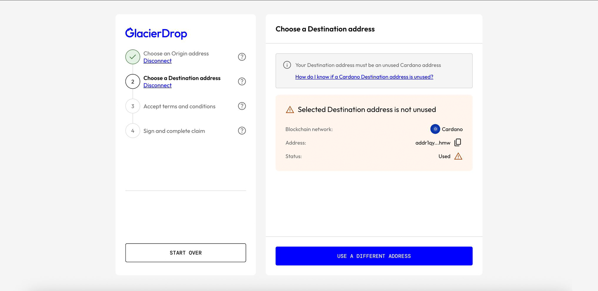 Out of 4 wallets tested (Lace, Eternl, Typhon, and VESPR), only Lace automatically selected an Origin and Destination address from the same wallet seamlessly. For the others, we had to disconnect after step 1 and manually set the Destination address – thanks team for including that option.