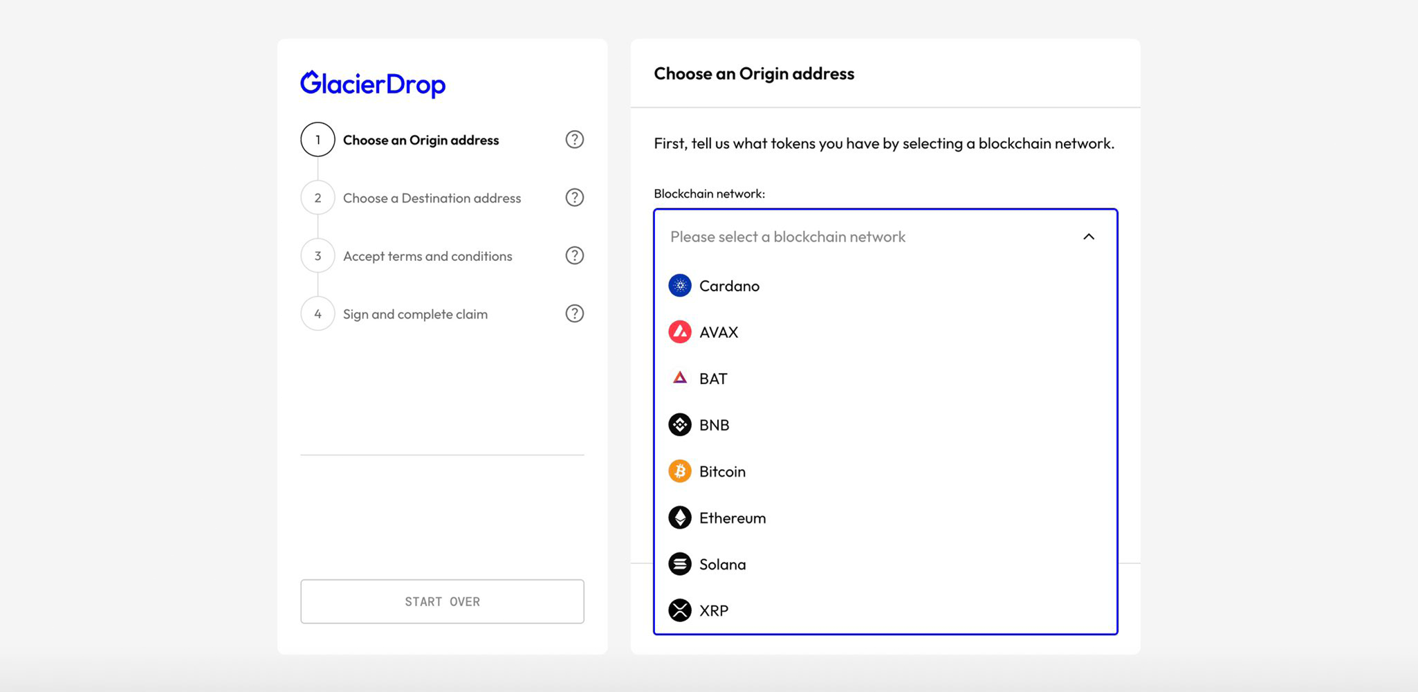 2. Blockchains ⛓️ The claiming platform supports all the big names — Bitcoin, Ethereum, XRP, Solana — but Cardano sits right at the top of the list. This guide focuses exclusively on Cardano. If you’re using another chain, the steps may differ.