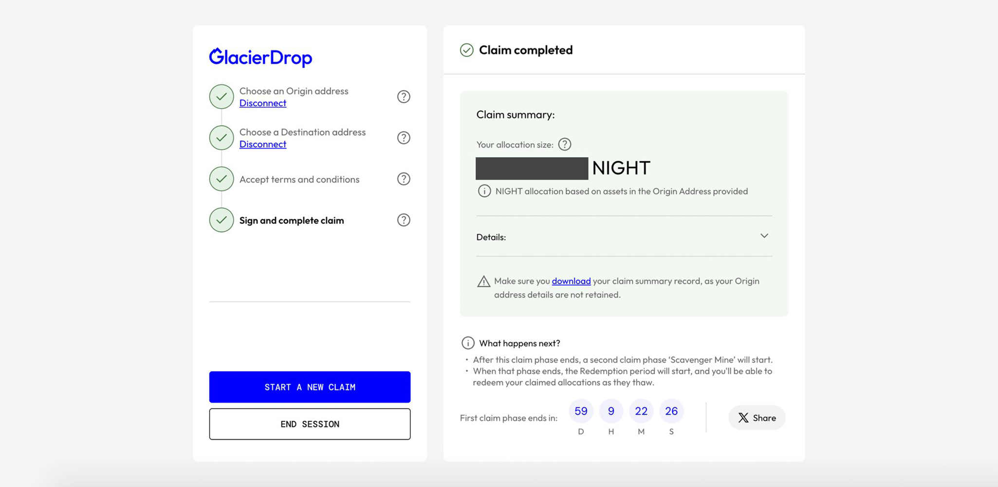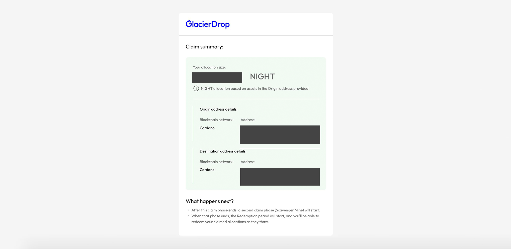 5. What happens next? 🔜 After jumping through all the hoops and clearing the hurdles – congrats, you did it! Claim complete. 🏁 But don’t bounce just yet make sure to download your GlacierDrop Claim document before you leave. You’ll thank us later.